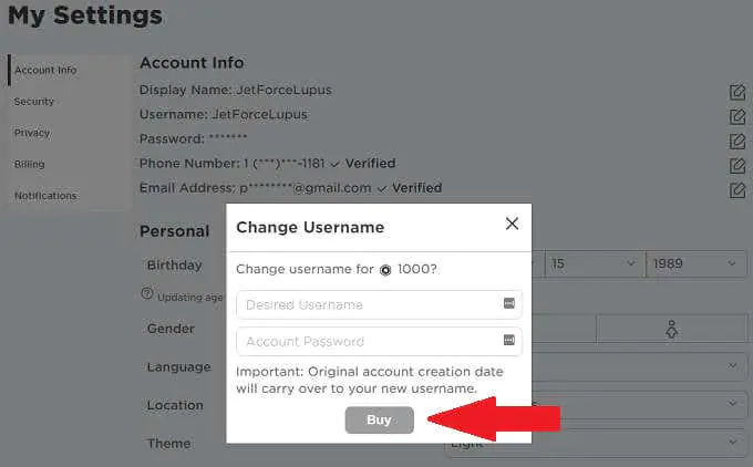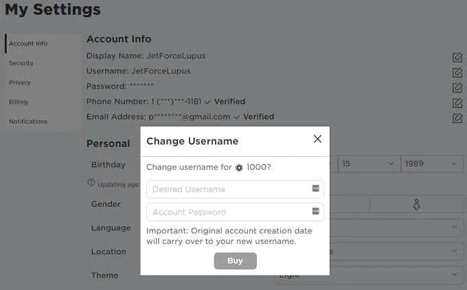 4.Kullanıcı adınızı değiştirmek için oyunun dijital para birimi olan 1.000 Robox harcamanız gerekmektedir. İstediğiniz yeni kullanıcı adını ve hesap şifrenizi girin.