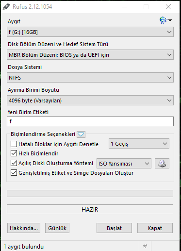 - Öncelikle Rufus 2.12.1054 yazılımını indiriyoruz; birçok sitede bulunuyor. İndirip kurduktan sonra aşağıdaki gibi bir pencere açılıyor.