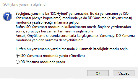 ISO dosyası olarak indirdiğimiz için ISO dosyası olarak yazdıracağız. OK butonuna tıklıyoruz ve devam ediyoruz. Şuna da değinelim bu arada; Linux işletim sistemi ISO imaj dosyaları, Linux dağıtımlarının kendi sitelerinde ücretsiz olarak veriliyor.