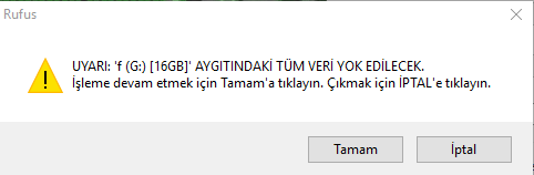 OK butonuna tıkladıktan sonra gelen uyarıda, taktığımız flash belleğin içindeki verilerin silineceği bilgisi verilmekte; Tamam butonuna tıklıyoruz.