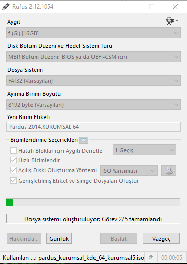 Ve Başlat butonuna tıklıyoruz, ardından yazma işlemi başlamış oluyor.