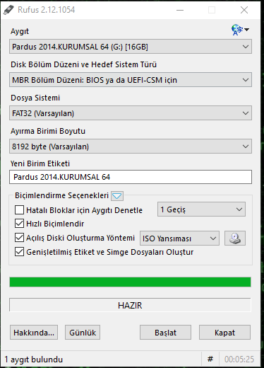 İşlemler bittikten sonra programımızda “HAZIR” uyarısını göreceğiz. Bu uyarı flash belleğimizin hazır olduğunu bildiriyor. Böylece Linux Pardus işletim sistemimizi flash belleğimize yazdırdık ve ardından kurmak istediğimiz bilgisayara kurucağız. Teknodestek‘te bulunan diğer makalelerimizde Linux işletim sisteminin nasıl kurulduğunu anlatan makalelerimizi bulabilirsiniz.