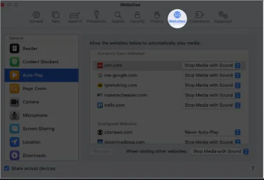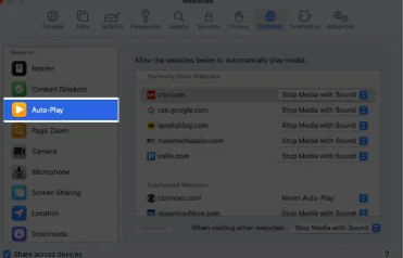 Web sitesi otomatik oynatma olarak seçer iseniz, Safari ayarların da yapılandırılmış Web sitesi olarak listelenir.