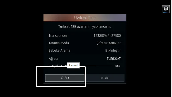 • Gelen ekrandaki seçeneklerde Transponder ayarı 12380/27500 dikey, tarama modu bölümünde ise şifresiz kanallar ve şebeke arama seçenekleri seçilerek arama başlatılabilir.
