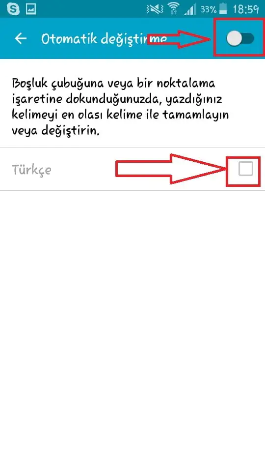 - Ve ayrıca alt kısmında bulunan, Boşluk çubuğuna veya bir noktalama işaretine dokunduğunuzda yazdığınız kelimeyi en olası kelime ile tamamlayıp veya değiştirin yazısının altında bulunan Türkçe seçeneğini işaretlendikten sonra Samsung Android Cihazlarda Klavye Dil Seçeneğini Değiştirme işlemlerini tamamlamış olacaksınız.