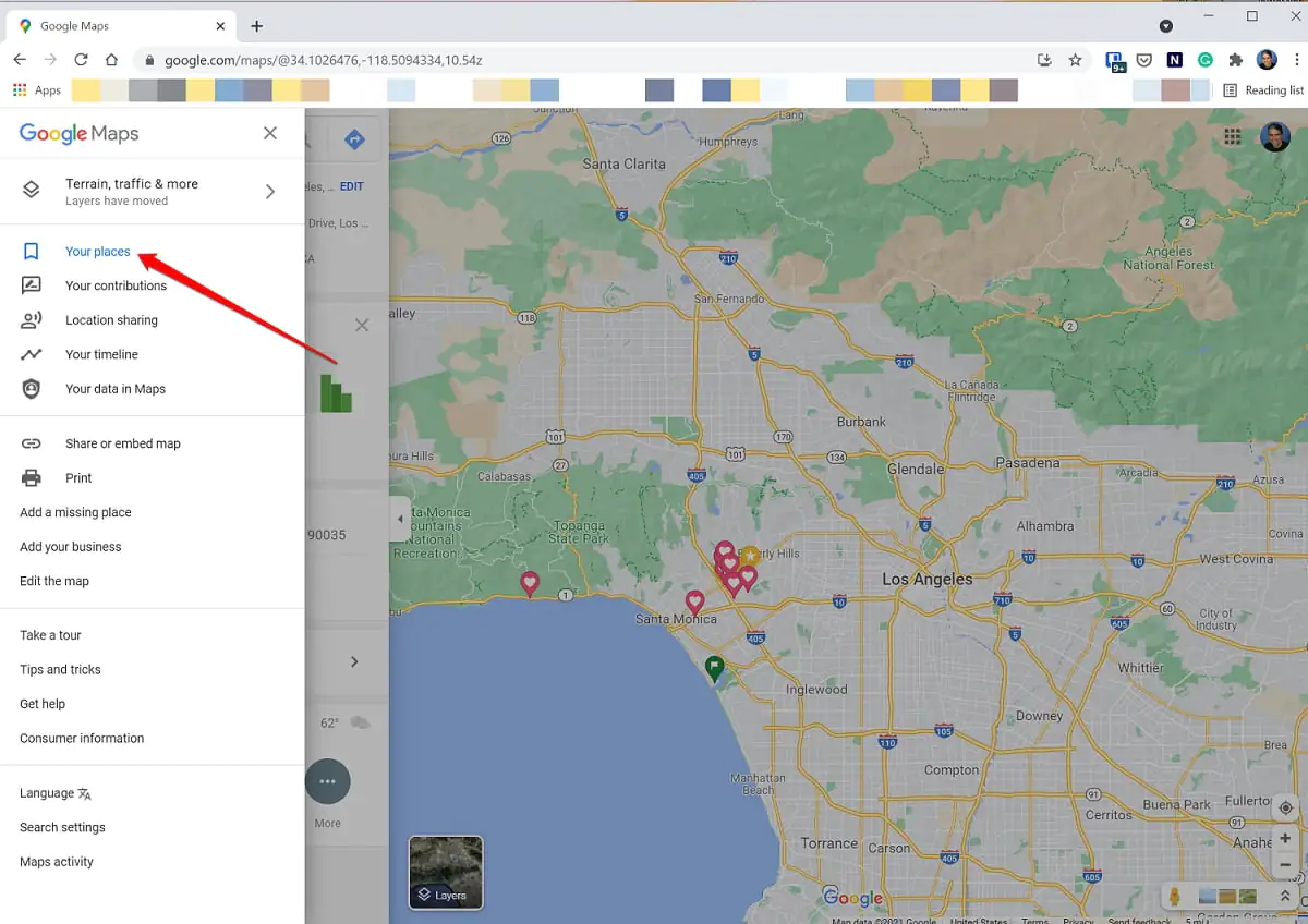 - Daha sonra sol üst köşedeki ≡ (üç çizgi) menüsüne tıklayın. Ardından, açılan menü listesinde Yerleriniz (Your places) menüsüne tıklayın.