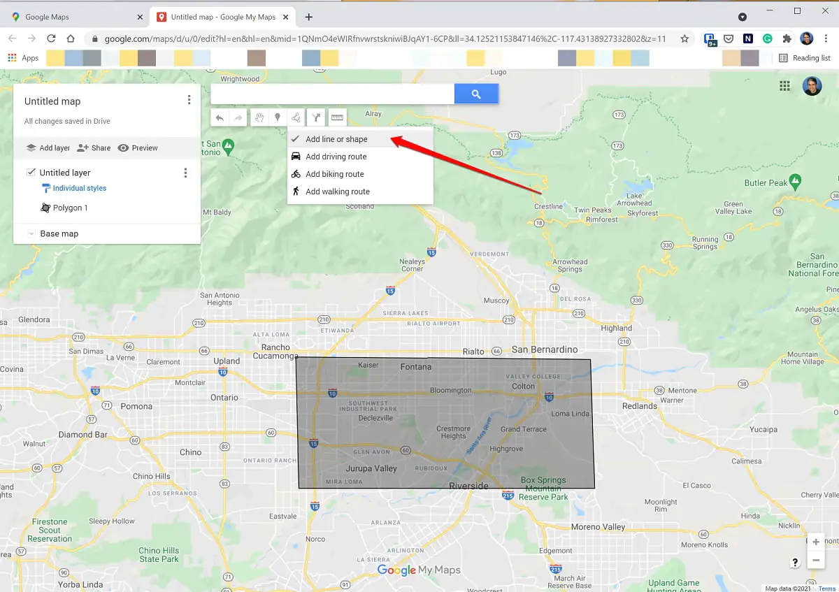 - Üst kısımda arama kutucuğunun altındaki üç çizgi simgesine benzeyen, Çizgi çiz butonuna tıklayın. Açılan menü listesinde Çizgi veya şekil ekle (Add line or shape) menüsüne tıklayın. Ardından, haritanıza çizgiler ve şekiller eklemek ve düzenlemek için, yukarıda paylaştığımız adımları izleyin.