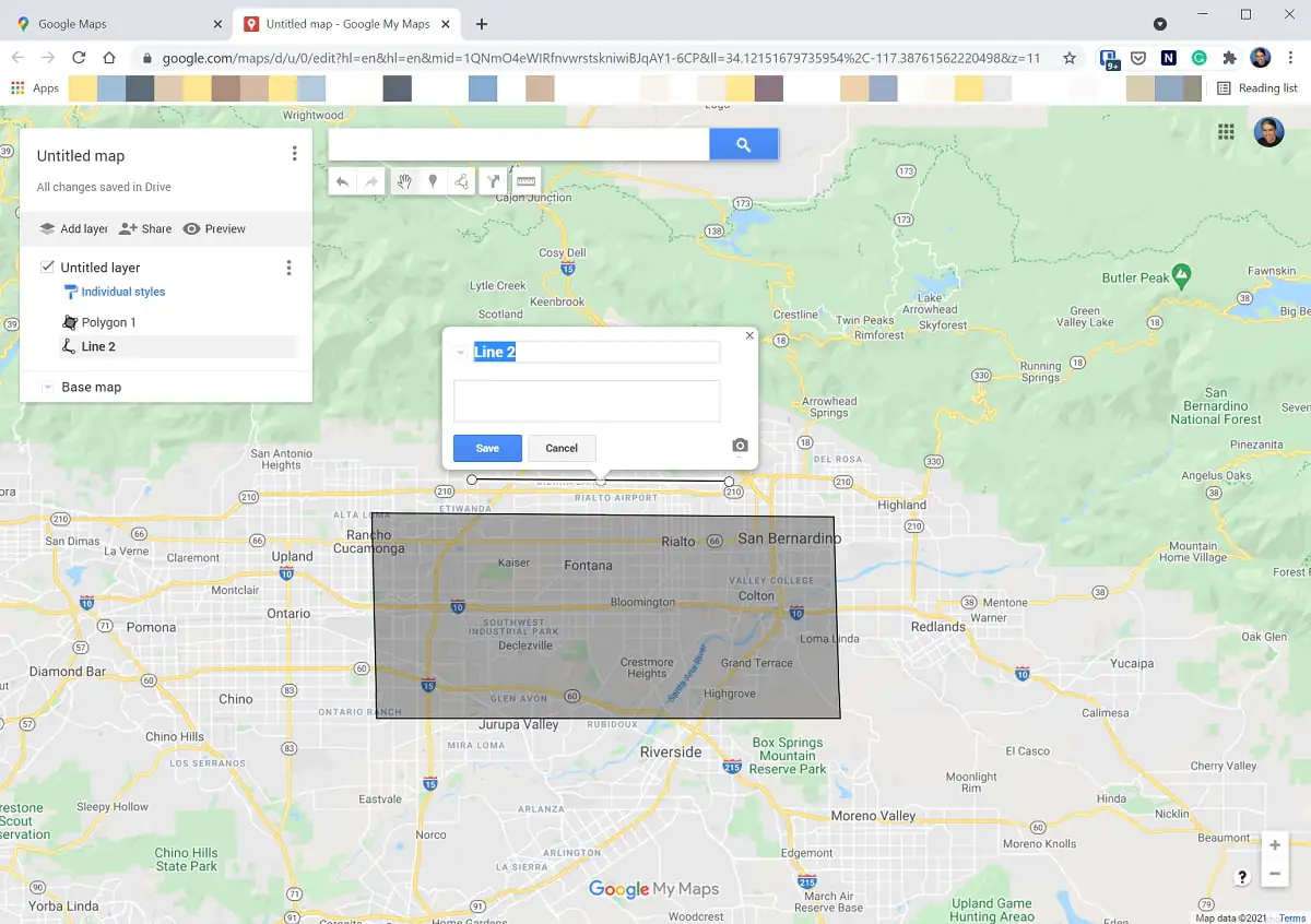 - İletişim kutusunda, haritaya eklediğiniz çizgiye veya şekle bir isim verin ve Kaydet (Save) butonuna tıklayın.