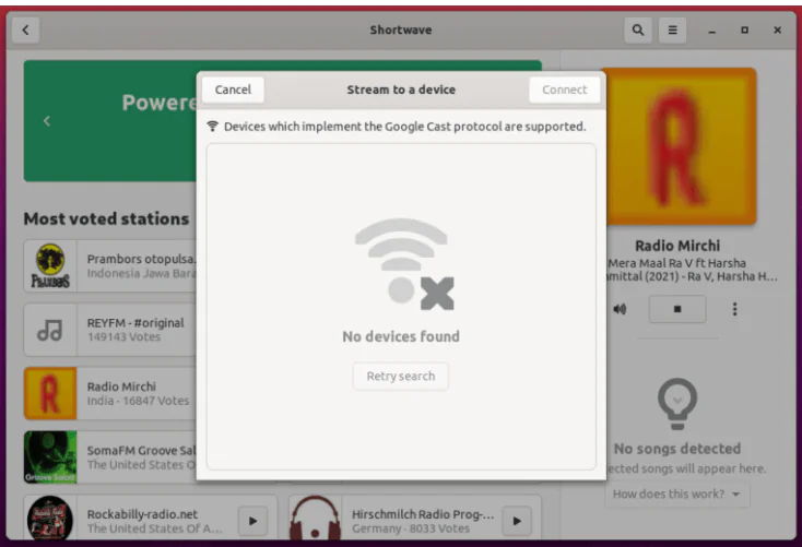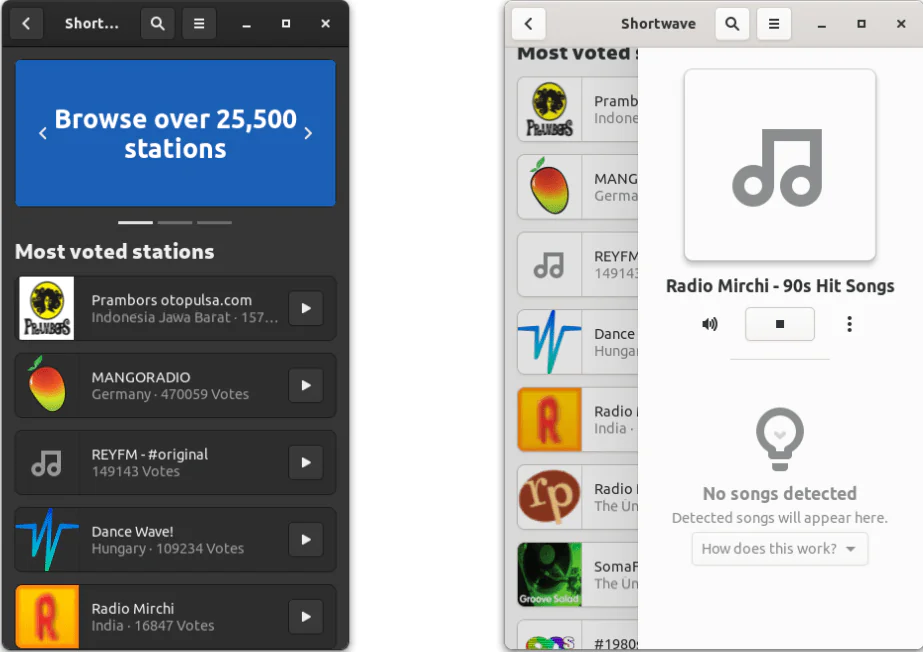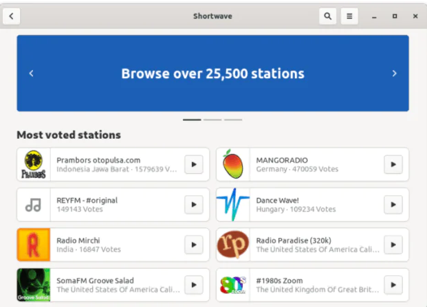 Shortwave, Linux masaüstü için ücretsiz ve açık kaynaklı bir İnternet radyo oynatıcısıdır. Radio-browser.info topluluk veritabanı aracılığıyla 25.500’den fazla İnternet radyo istasyonuna erişmenizi sağlar .