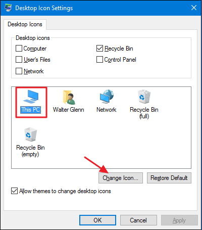 Ve değişikliği geri almak isterseniz, her zaman “Masaüstü Simge Ayarları” penceresine geri dönebilir, eski haline getirmek istediğiniz simgeyi seçebilir ve ardından “Varsayılanı Geri Yükle” yi tıklayabilirsiniz.