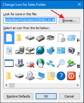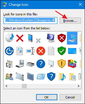 “Simgeyi Değiştir” penceresinde, yerleşik Windows simgelerinden istediğiniz herhangi bir simgeyi seçebilir veya kendi simgelerinizi bulmak için “Gözat” öğesine tıklayabilirsiniz.