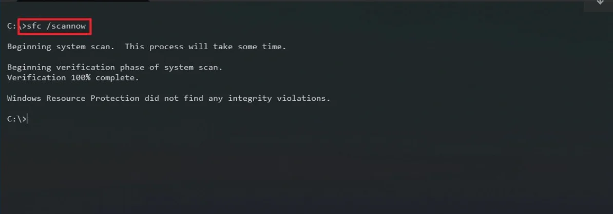 - Windows Kaynak Koruması herhangi bir bütünlük ihlali bulamadı; bu, sistemde herhangi bir bozuk veya eksik dosya bulunmadığını gösterir.