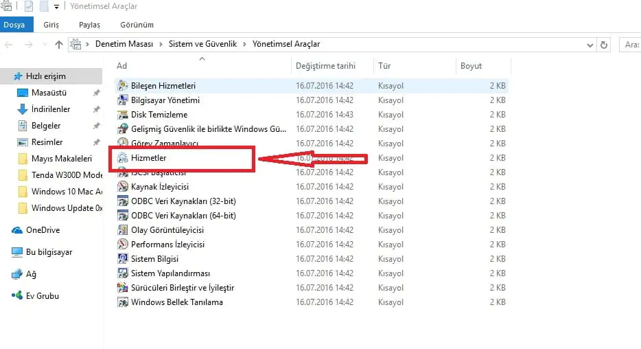 • Açılan ‘Yönetimsel Araçlar’ penceresindeki listeden ‘Hizmetler’ bölümüne tıklıyoruz.