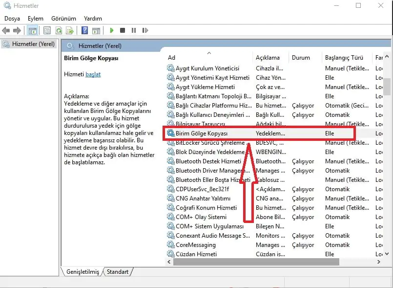 • Açılan ‘Hizmetler’ penceresindeki listede ‘Birim Gölge Kopyası’ servisinin ‘Başlangıç Türü’nün ‘Otomatik’ olması ve ‘Durum’unun da ‘Çalışıyor’ olması gerekir. İşlem yaptığımız bilgisayarda, aşağdaki ekran görüntüsünde de gördüğünüz gibi, bu servis kapalı görünüyor. Bu servisin üzerine gelip sağ tıkladıktan açılan menü listesinden ‘Özellikler’ menüsüne tıklıyoruz.