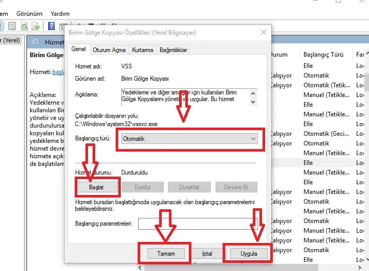 • Açılan pencerede ‘Başlangıç Türü’ ayarı ‘Elle’ olarak yapılandırılmıştır; bu ayarı ‘Otomatik’ olarak düzenliyoruz.