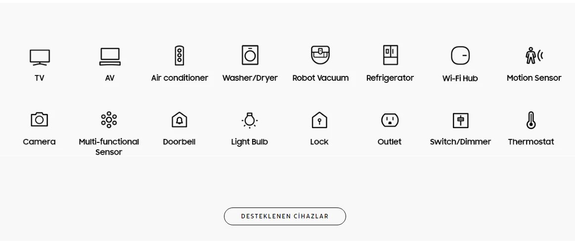 SmartThings ile birden fazla cihazı daha hızlı ve daha kolay bağlayabilir ve kontrol edebilirsiniz. Nerede olursanız olun, akıllı cihazları, ev aletlerini (buzdolabı, içecek dolabı, çamaşır makinası, çamaşır kurutucu, fırın aralığı, bulaşık makinesi, ocak, mutfak robotu hızlı vakum, klima, hava temizleyici vb.) , TV ve sunucuya yani modeme wifi den kayıtlı hoparlörler ve adaptörlerin tamamı artık tek tuşla kontrol yapılabilmektedir..