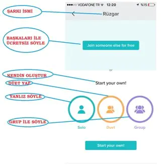• Bu sayfada seçenekleri takip ederek ne yapmak istediğimizi seçmeliyiz. En üste, seçmiş olduğumuz şarkının ismi vardır. “Başkaları ile söyle” seçeneği ile, daha önce hazırlanmış ve sizin söylemeniz gereken yerler söylenmemiş şekildedir. Diğer kullanıcılar tarafından oluşturulmuş şarkılar yer alır.