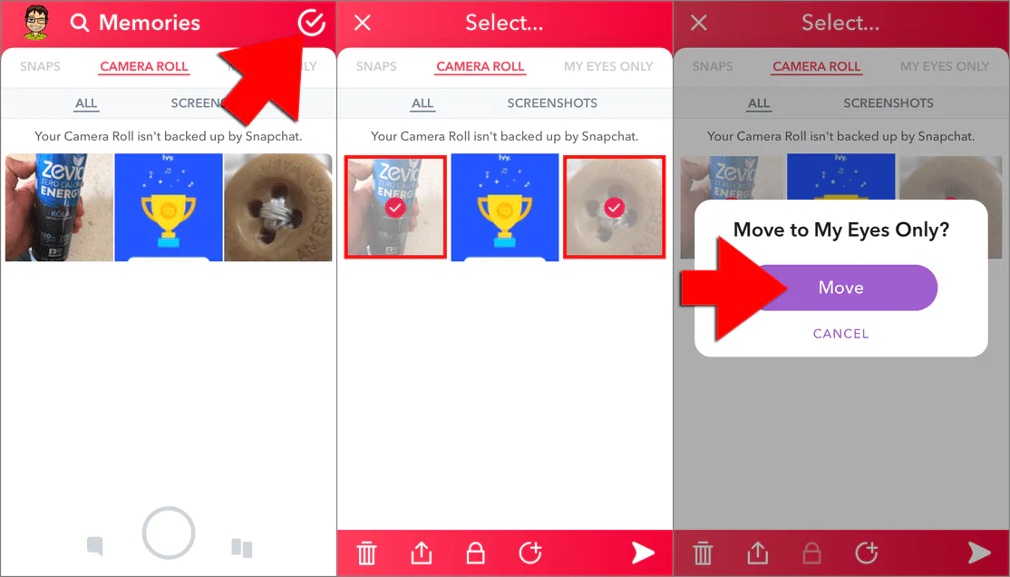 - Snapchat, seçtiğiniz snapleri Sadece Ben (Only My Eyes) bölümüne taşıma işlemi sürecinde sizi yönledirip yardımcı olacak.