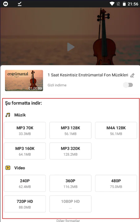 Açılır bir menüde indirmek istediğiniz multimedyayı istediğiniz kalitede indirebilirsiniz. Seçtiğiniz kaliteye dokunup indirebilirsiniz