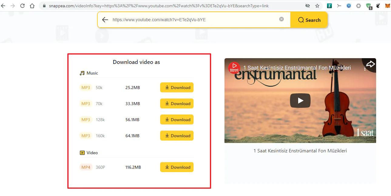 Arama bittikten sonra karşınıza seçtiğiniz multimedyanın çeşitli kalitede mp3 leri ve dilerseniz video linki gelecektir. Dilediğiniz dosyayı indirmeniz için “Download” ı (indir) tıklayıp bilgisayarınızda istediğiniz sürücünüzdeki klasöre indirebilireceğiniz gibi daha önceden tarayıcınız ayarladıysanız İndirilen / Karşıdan Yüklenen klasörünü kontrol ettiğinizde İndirdiğiniz doayayı göreceksiniz