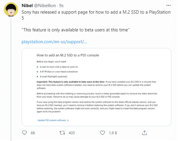 Konsol içerisinde M2 SSD yuvası olmasına rağmen kullanım imkânı sunulmuyordu. Kullanıcıların bu konuda olan şikâyetini dikkate alan Sony, yeni beta güncellemesi ile birlikte kullanım imkânını sundu.