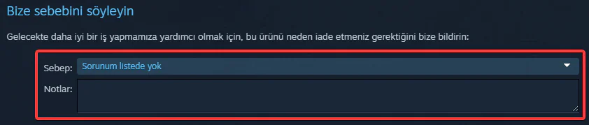- Bu bölüm önemli, oyunu neden iade etmek istediğinizi açıklayan bir metin girmeniz gerekiyor.