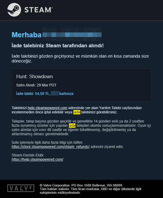 İadeden gelecek olan paranızı, oyunu satın aldığınız karta veya Steam cüzdanınıza aktarabilirsiniz. Daha fazla bilgi için buraya tıklayarak Steam’in iade politikasını daha detaylı bir şekilde inceleyebilirsiniz.