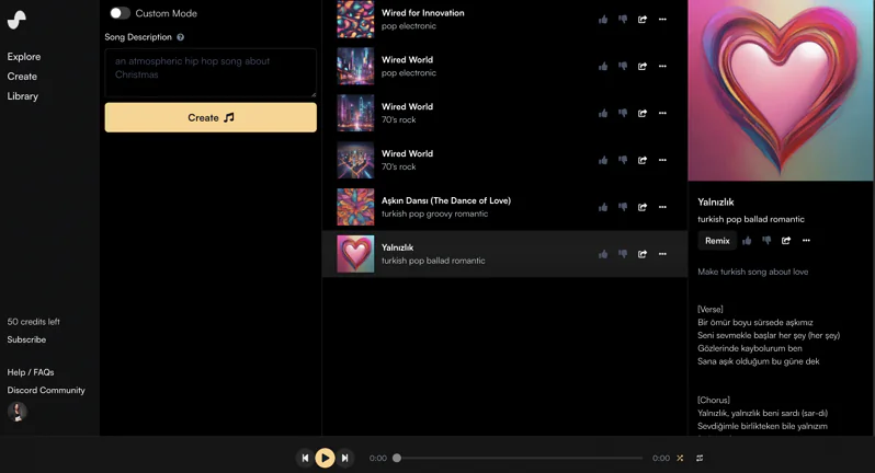 Yapay zekâ teknolojisini kullanarak kullanıcıların metin girdilerinden özgün şarkılar oluşturmasına olanak tanıyan bir müzik üretim platformudur. En dikkat çekici yönü, hiçbir teknik bilgiye gerek duymadan profesyonel kalitede müzik ortaya çıkarabilmenizdir.