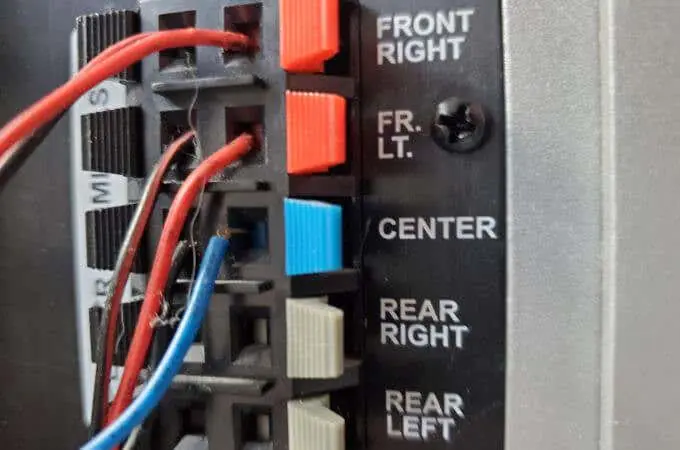 Not : Bazı sistemler hoparlörlerden gelen bileşen ses kablolarını kullanır . Bu durumda bakır tel uçlarını bağlantı noktalarına yerleştirmek yerine; her bir bileşen ucunu doğru bağlantı noktasına girmeniz gerekir. Genellikle bu, Ön Sol hoparlörden gelen tek bir beyaz kablo; Ön Sağ Hoparlörden gelen tek bir kırmızı kablo vb.