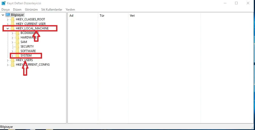 - Açılan pencerede sol tarafta yer alan menüler içerisinde, ‘HKEY_LOCAL_MACHİNE’ menüsünün yanındaki ok simgesine tıklıyoruz.