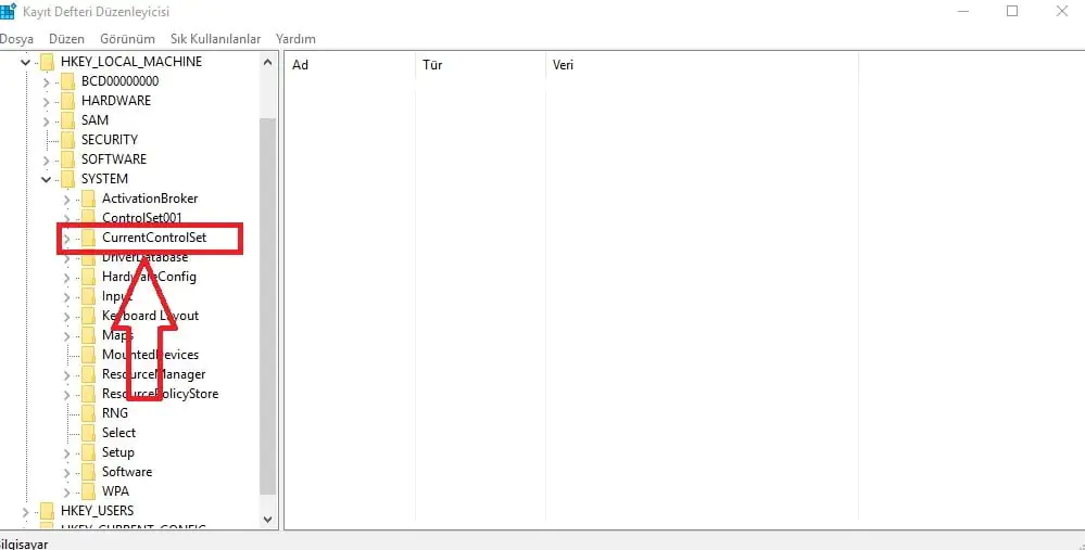 - ‘SYSTEM’ menüsü altında açılan menü listesinde ‘CurrentControlSet’ menüsüne veya bu menünün yanındaki ok simgesine tıklıyoruz.