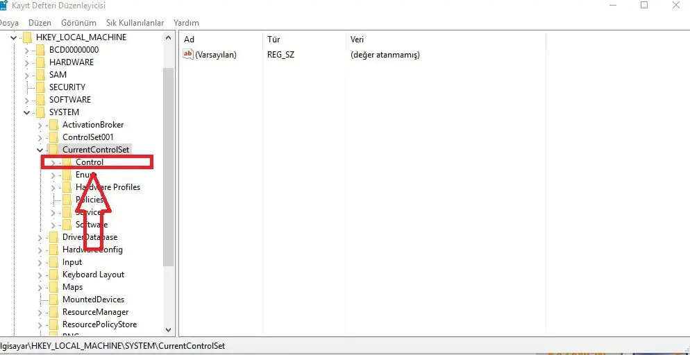 - ‘CurrentControlSet’ menüsü altındaki alt menülerden ‘Control’ menüsüne tıklıyoruz.