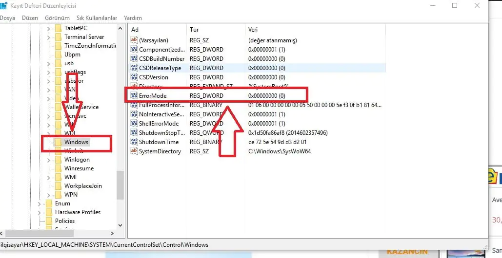 - ‘Control’ menüsü altındaki alt menülerden ‘Windows’ menüsüne tıklıyoruz ve pencerenin sağ kısmında çıkan menü listesinden de ‘ErrorMode’ menüsünün üzerine gelip, mouse ile çift tıklıyoruz.