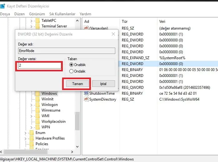 - Açılan pencerede ‘Değer verisi’ normalde ‘0′ olarak belirlenmiştir. Bu alandaki değeri ‘2′ olarak değiştirdikten sonra ‘Tamam’ butonuna tıklayıp, bilgisayarı yeniden başlatıyoruz.