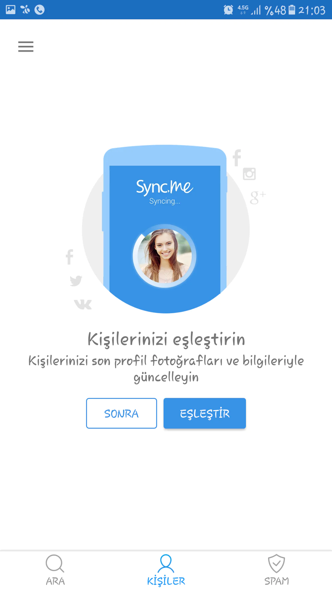 Bu bölümde karşımıza ilk olarak, kişilerimizi eşleştirmek isteyip istemediğimizle ilgili bir sayfa gelecek. ‘Sonra’ seçeneği ile ilerleyebiliriz; ama ‘Eşleştir’ diyerek de, kişilerimizin sosyal medyadaki fotoğrafları ve diğer bilgilerini senkronize edebiliriz.