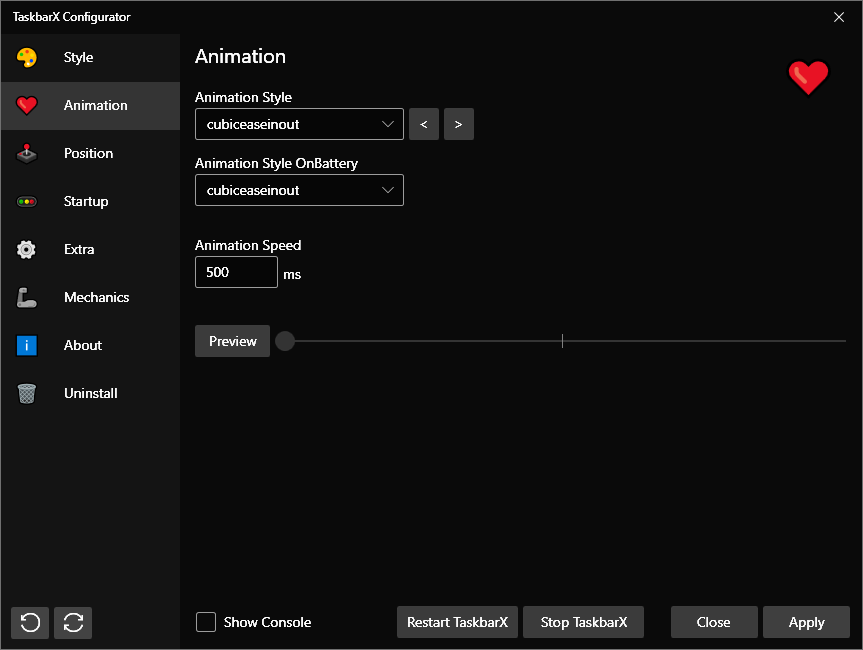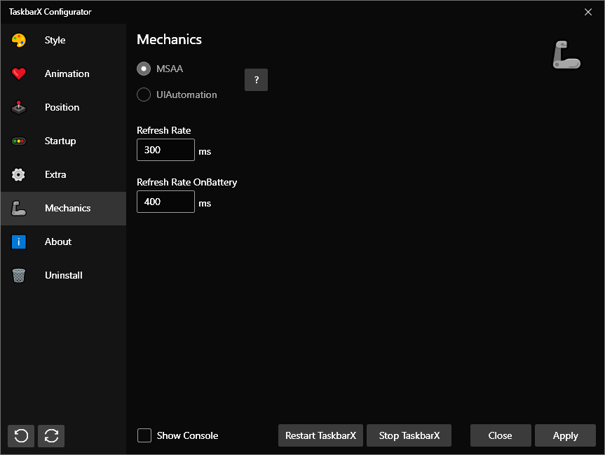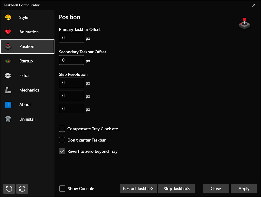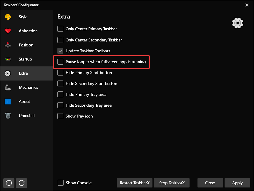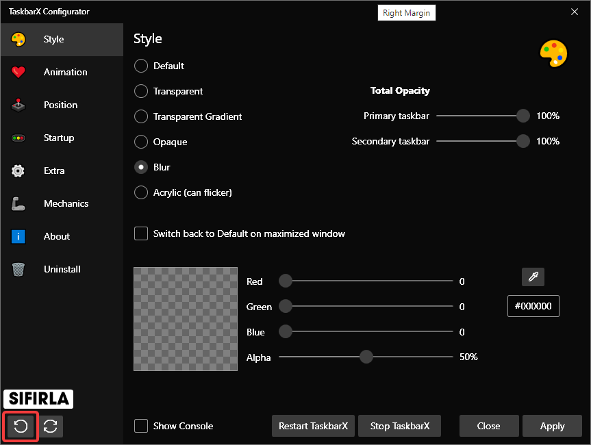 İstediğiniz zaman TaskbarX’i yeniden başlatabilir veya durdurabilirsiniz, sadece herhangi bir ayar menüsüne gidip aşağıdaki Restart / Stop butonlarından uygun olana basmanız yeterli. Dilerseniz Uninstall kategorisinden de uygulamayı bilgisayarınızdan kalıcı olarak kaldırabilirsiniz.