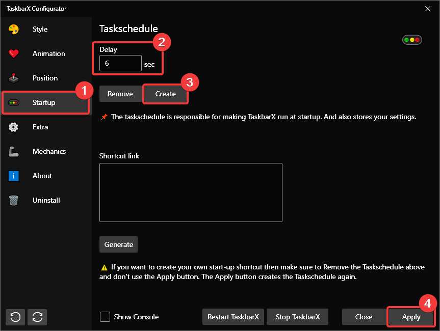 Sol taraftan Startup menüsüne tıklayın ve dilediğiniz gecikme süresini girin. Çoğu kullanıcı için altı saniye gayet idealdir. Sürenizi belirledikten sonra Create butonuna tıklayarak zamanlamayı oluşturun ve ardından Apply butonuna tıklayarak seçimlerinizi onlaylayın.