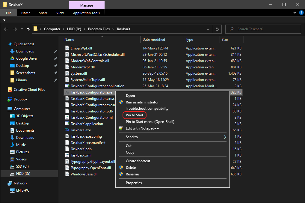 Başlatma menüsünde kısayol oluşturmak için TaskbarX Configurator dosyasına sağ tık yapın ve “Başlangıç’a sabitle” seçeneğine tıklayın. Dilerseniz aynısını TaskbarX için de yapabilirsiniz.