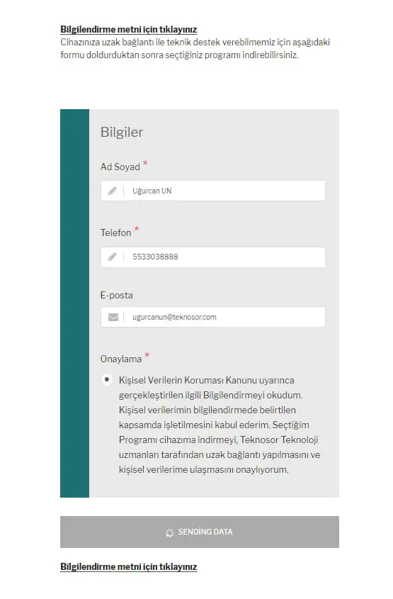 Son kullanıcıdan kişisel veriler içeren akıllı cihazına erişim konusunda yasal mevzuat gereği muvafakatname onayı alınıyor. İlgili form doldurma işlemi yapılırken son kullanıcı çağrı sırasında formun doldurulması konusunda çağrı destek uzmanı tarafından yönlendiriliyor.
