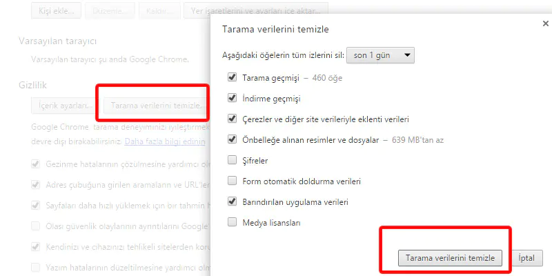 1- Chrome’un Önbelleğini ve Verilerini Temizleyin: