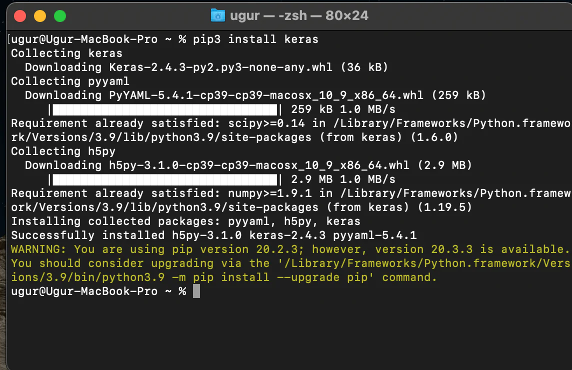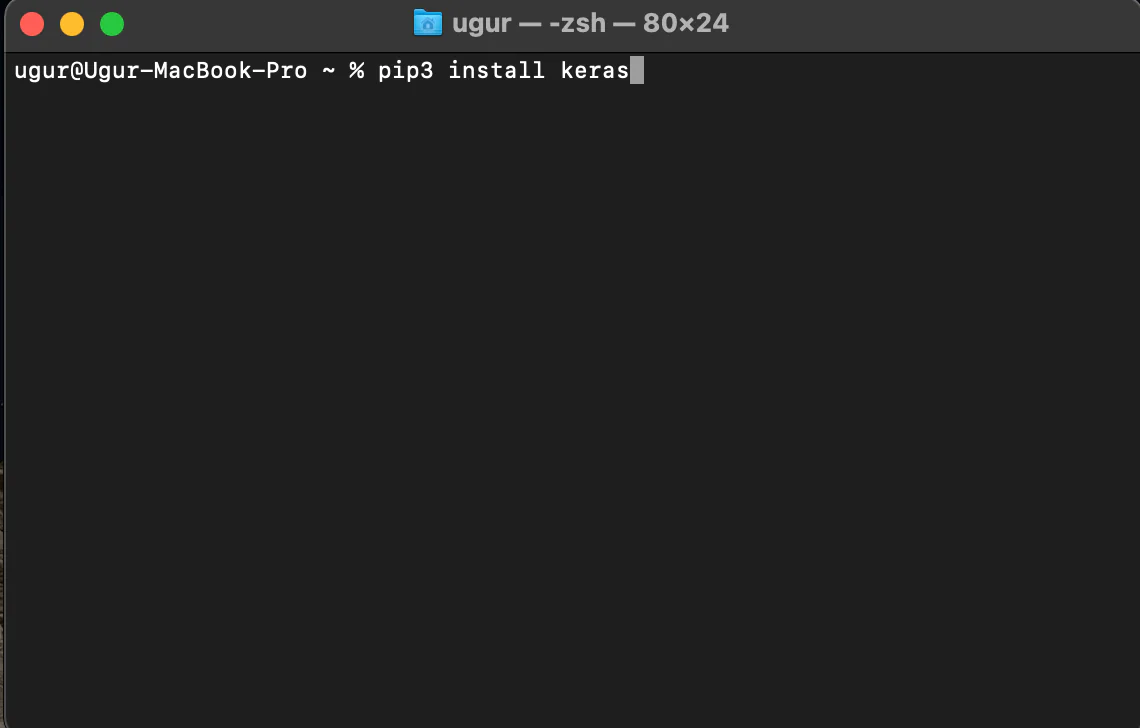 Mac os işletim sisteminde ,Linux veya Windows tabanlı bilgisayarlarda terminal üzerinden kütüphanelerimizi yükleyebiliriz. Kullanmakta olduğumuz IDE ye göre kullanacağımız yazılım diline göre değişkenlik göstermesinin yanında biz burda mac os işletim sisteminde python için keras kütüphanesini yükleyeceğiz.Bunun dışında bir kütüphane isterseniz de aynı şekilde yüklemesini yapabiliriz.