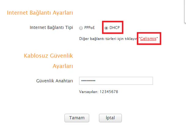 Ara yüze giriş sağladıktan sonra gelen sayfada DHCP yazan butonun başında bulunan küçük simgeye tıklıyoruz. Alt bölümde gelişmiş seçeneği bulunmakta Gelişmiş’e tıklıyoruz kurulum sayfası gelmektedir.
