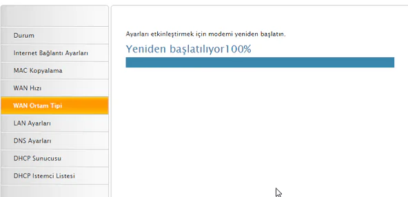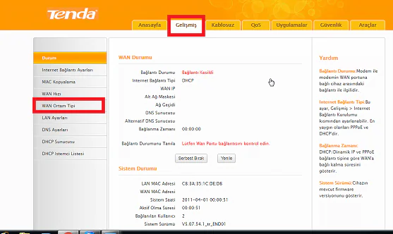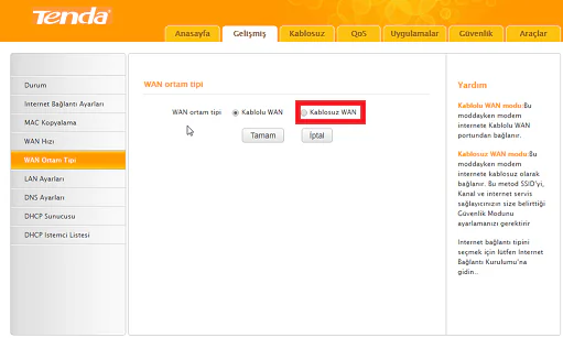 - Kurulum sayfasında üst bölümde Gelişmiş seçeneğine tekrar tıklıyoruz. Sol tarafta WAN Ortam Tipi yazan seçeneğe tıklıyoruz ve gelen sayfada ana modem ile eşleştirme yapacağız.