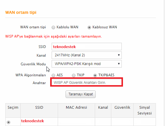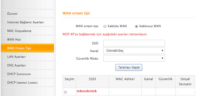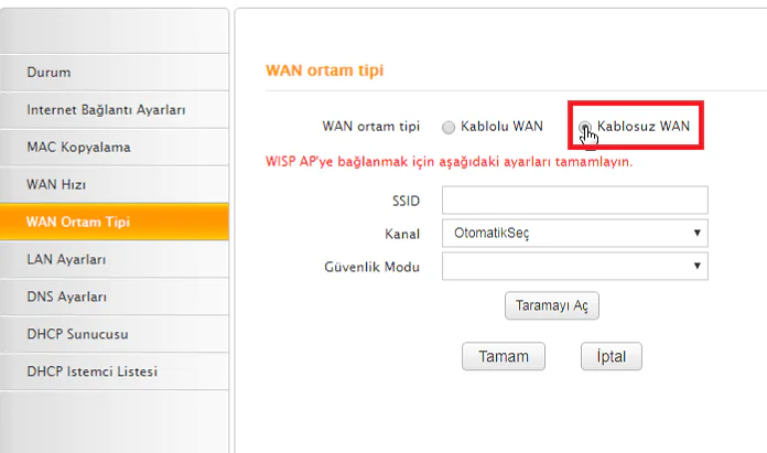 - Gelen ekranda iki modem arası kablolu ya da kablosuz bağlantı seçeneği bulunmakta. İki modem arası kablosuz sinyal güçlendirici olarak Kablosuz WAN seçeneğini tıklıyoruz. Bu adımdan sonra ana modem eşleştirmesini sağlayarak işlemlerimize devam edeceğiz.