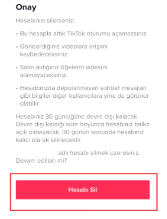 Tüm işlemleri takip ettikten sonra hesabınız kalıcı olarak silinmesi üzere işleme alınacaktır. Eğer 30 gün boyunca sizler hesabına giriş yapmazsanız hesabınız kalıcı olarak silinecektir. Eğer 30 gün içerisinde hesabınızı silme işleminden herhangi bir sebeple vazgeçebilirsiniz. Böyle bir durumda normal bir şekilde telefon veya kullanıcı adı ve şifrenizle hesabınıza giriş yapınız. Hesabınız tekrar otomatik olarak aktif hale gelecektir. Yeniden hesabınızı silinmesi için ise yukarıdaki adımları tekrar uygulamanız gerekecektir. Kısaca hesap silme işlemini gerçekleştirdikten sonra hesabınızın tamamen silinmesi beklemelisiniz. Böylece tek yapmanız gerek 30 gün süre ile hesabınıza giriş yapmayı denememek olacaktır.