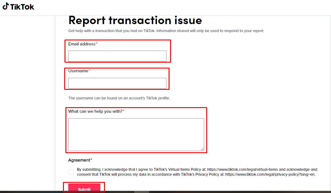 Tiktok rapor etmek istediğiniz bir soruna değinin veya TikTok deneyiminizle ilgili geri bildiriminizi belirtin. Paylaştığınız bilgiler yalnızca raporunuza yanıt vermek için kullanılacaktır