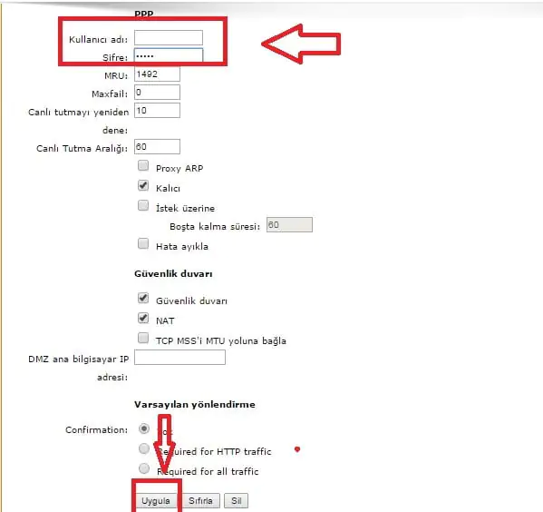 • Bu kutucuklara, internet servis sağlayıcınız tarafından sizlere verilen ADSL/VDSL Kullanıcı Adı ve ADSL/VDSL Şifre bilgilerini giriyoruz.