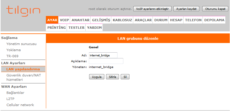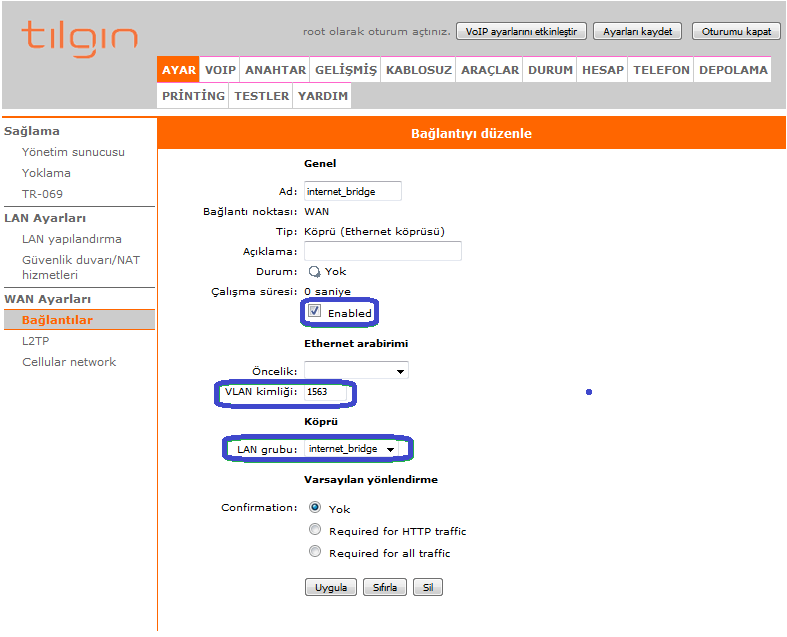 - İnternet bridge bağlantı ayarlarını, yeni LAN grubu ile ilişkilendirilmek için sırasıyla Ayar ⟶ WAN Ayarları ⟶ Bağlantılar sayfasında oluşturduğunuz ‘internet_bridge’ bağlantı ayarları ve bunu kullancak LAN grubu ayarlarını yapalım. Ad kısmına bir isim verebilir ya da yeni bağlantı ismini kullanabilirsiniz. Çalışma süresi acık olmalı; gerektiği durumda ‘VLAN kimliği’ için servis saglayicının sağladığı vlan bilgisini (1563) kullanın.