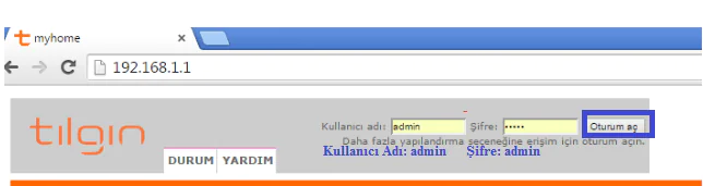 - Login (modem arayüzüne giriş) sayfası açılacaktır. Açılan login sayfasında Kullanıcı adı kutucuğuna “admin” ve Şifre kutucuğuna “admin” yazdıntan sonra Oturum aç butonuna tıklayınız.