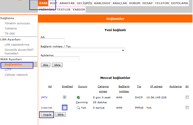 - Cihaz arayüzüne giriş yaptıktan sonra sırası ile Ayar ⟶ WAN Ayarları ⟶ Bağlantılar menülerine tıklayınız. İnternet bağlantısını, ekran görüntüsündeki gibi Enabled kutucuğundaki check işaretini kaldırıp Uygula butonuna tıklayarak pasif hale getiriniz.